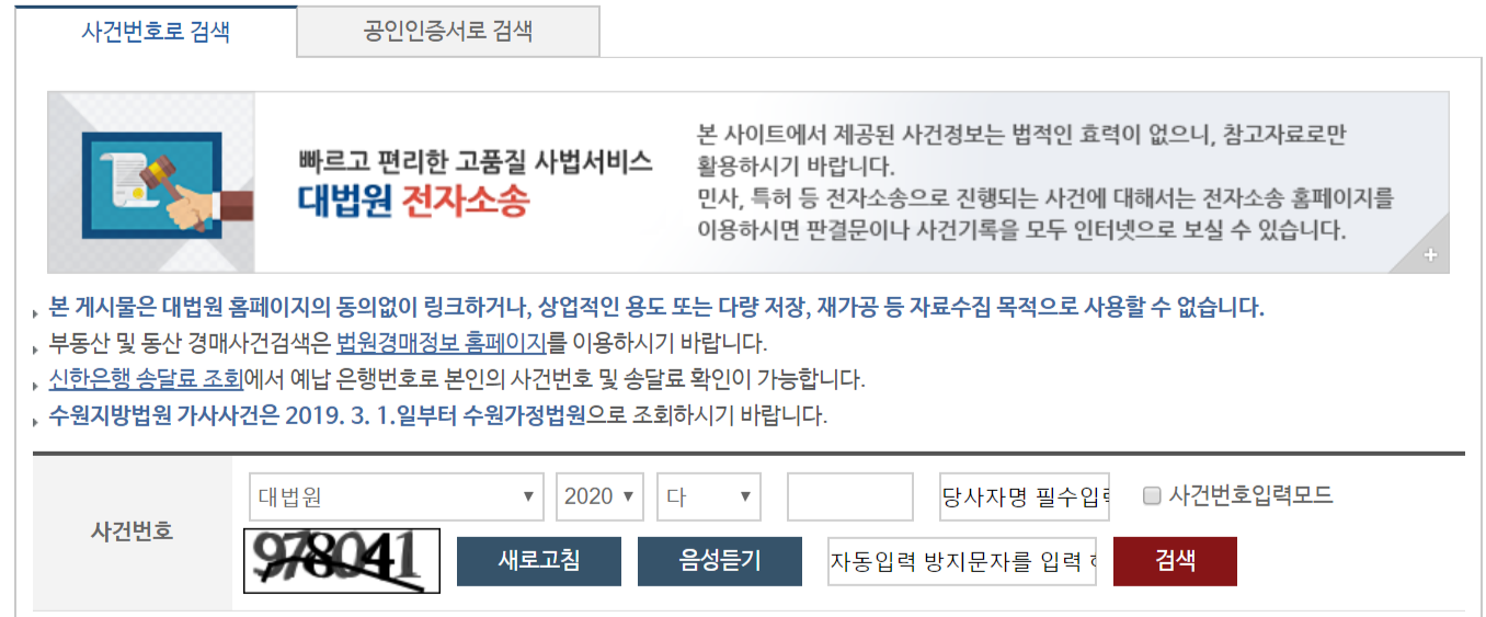 대한민국 법원 대국민서비스 사건검색 인터넷 사이트, 대법원 사이트에서 나의사건검색을 할 수 있는 곳입니다. 우리는 살면서 여러가지 일에 휘말릴 수 있습니다. 본인의 원하던 원치 않던 말이죠. 경매, 사건사고, 형사사건, 이혼 등등 그 이유야 셀수도 없죠. 일단 자의든 타의든 소송이 진행되게 될 경우 우리는 사건번호를 받습니다.